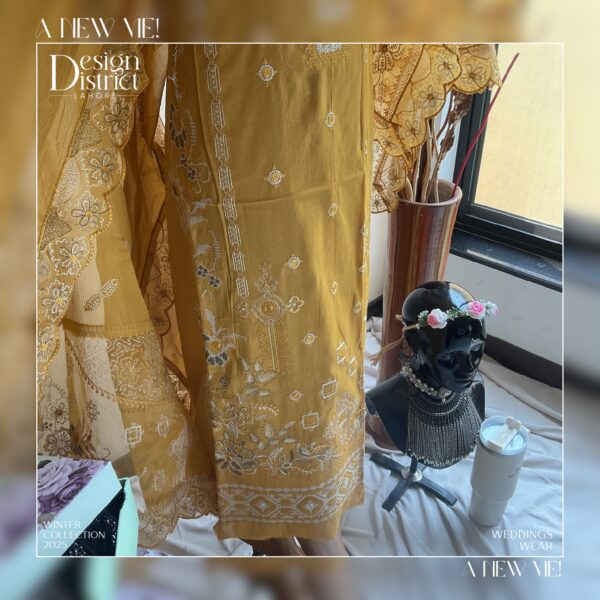 Stunning Gold three-piece set in a luxurious blend of Lawn and Chiffon Georgette.